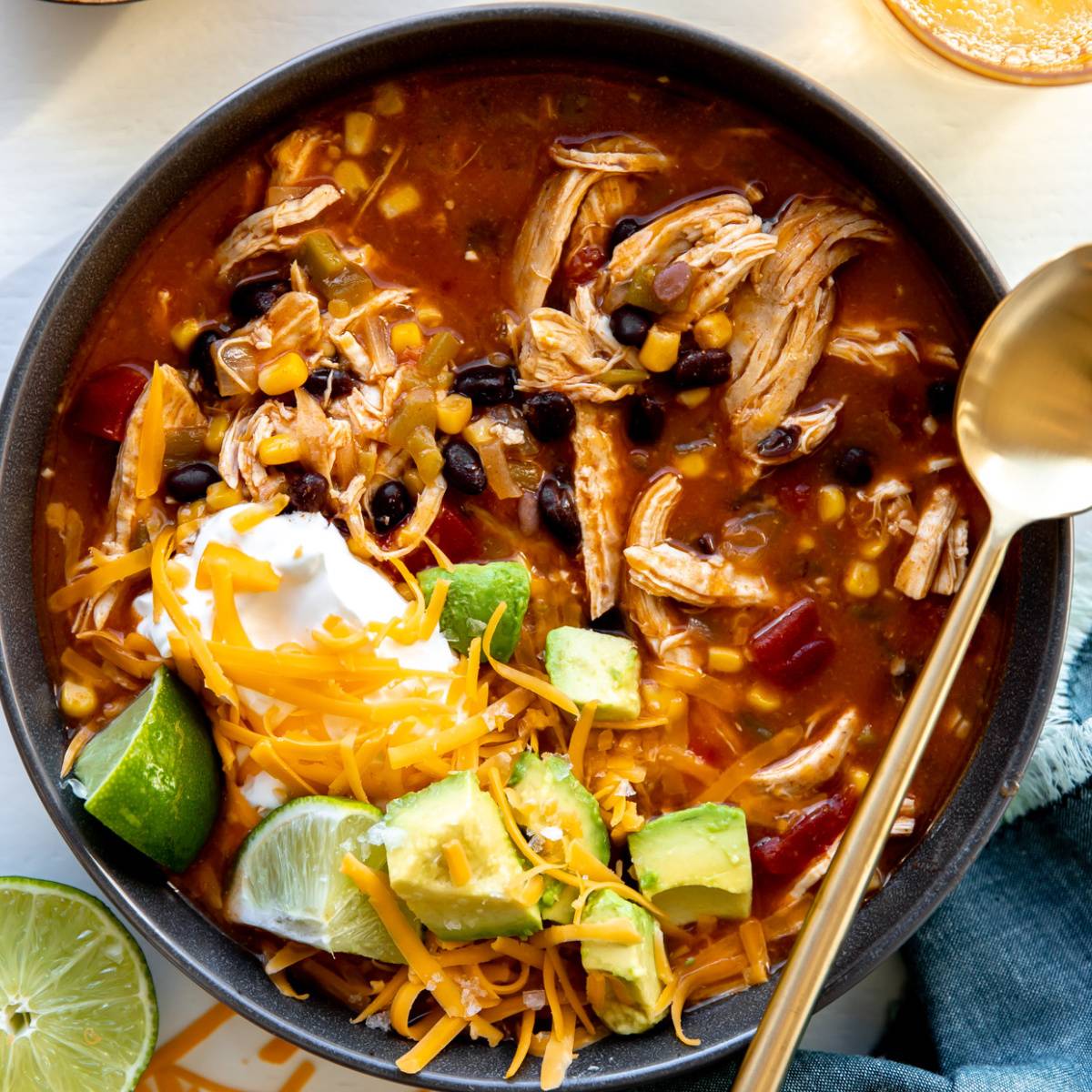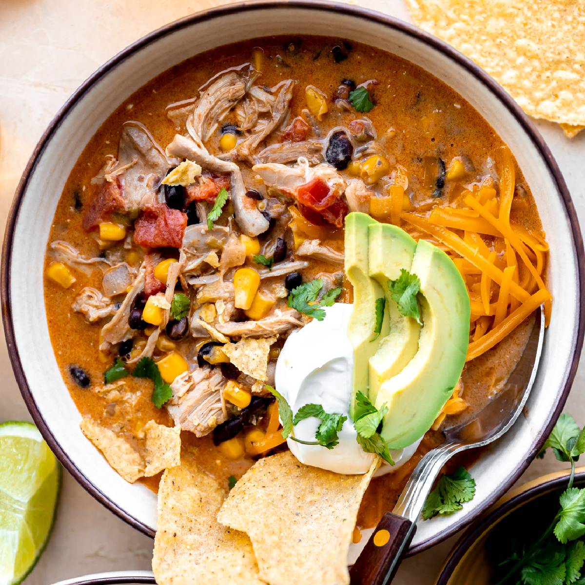 #9 Creamy Chicken Taco SoupChunks of tender chicken, black beans, corn and diced tomatoes and green chiles all in a creamy, warmly spiced broth.